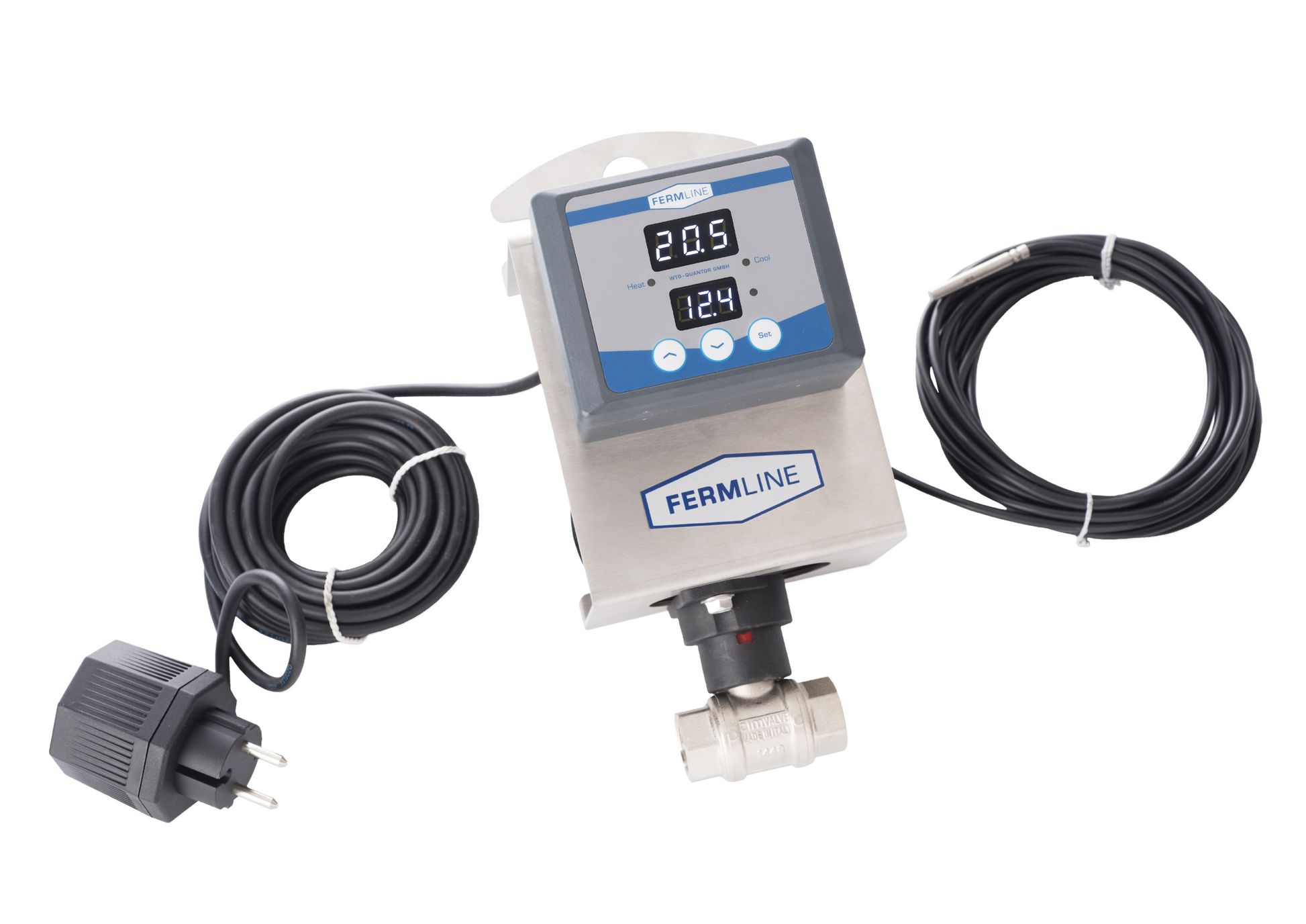 Temperature controller FermFlex-Mobile-M: Completely equipped device with motorized 1/2” solenoid valve, temperature sensor with a 5m length, and a transformer for 230V networks. It's mounted on a stainless steel plate with a hook and has IP65 protection for both the controller and solenoid valve.