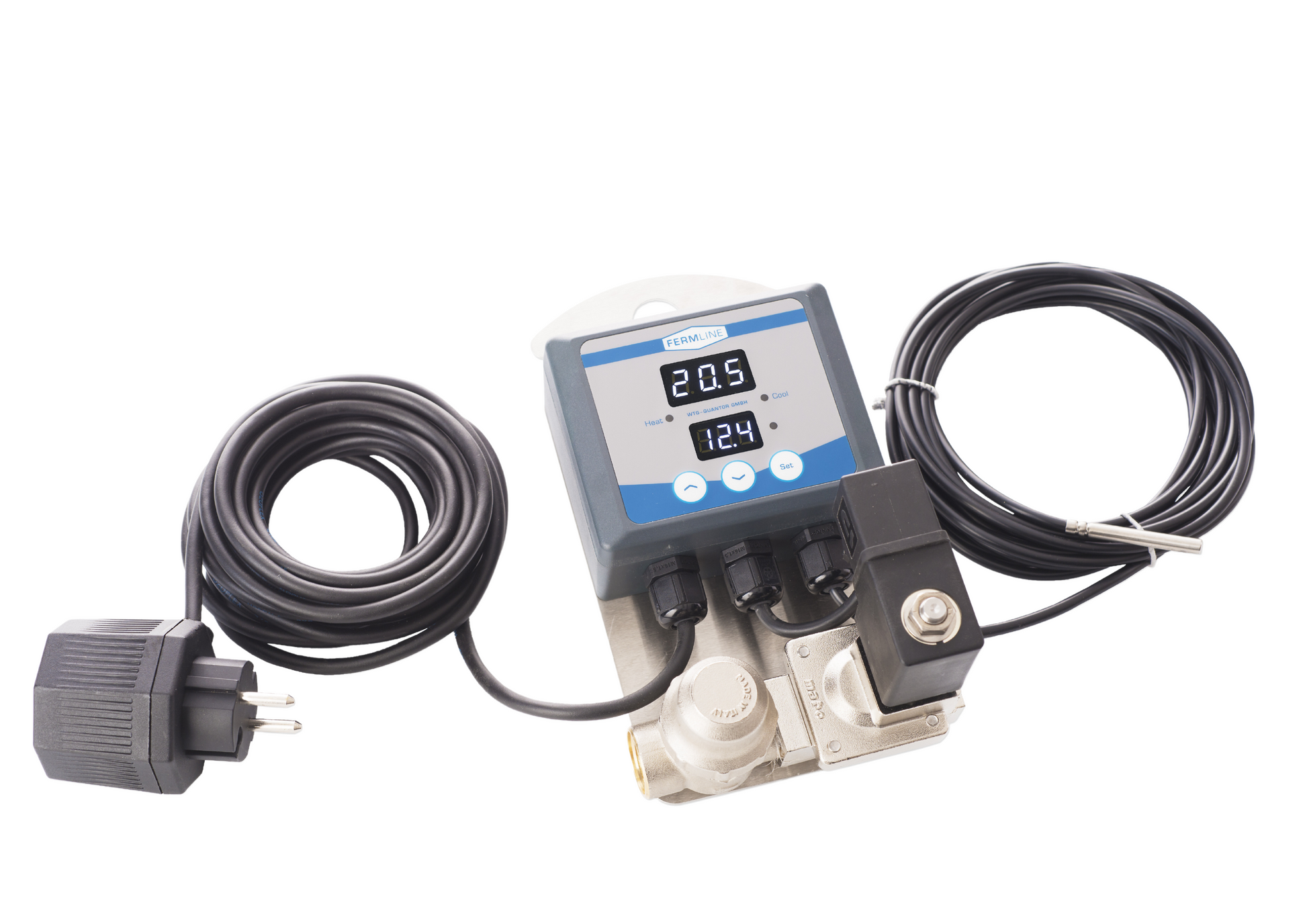 Temperature controller FermFlex-Mobile-S: This is a fully-equipped device with a 1/2” solenoid valve, filter, temperature sensor with a 5m length, and a transformer for 230V networks. It's mounted on a stainless steel plate with a hook and has IP65 protection for both the controller and solenoid valve.