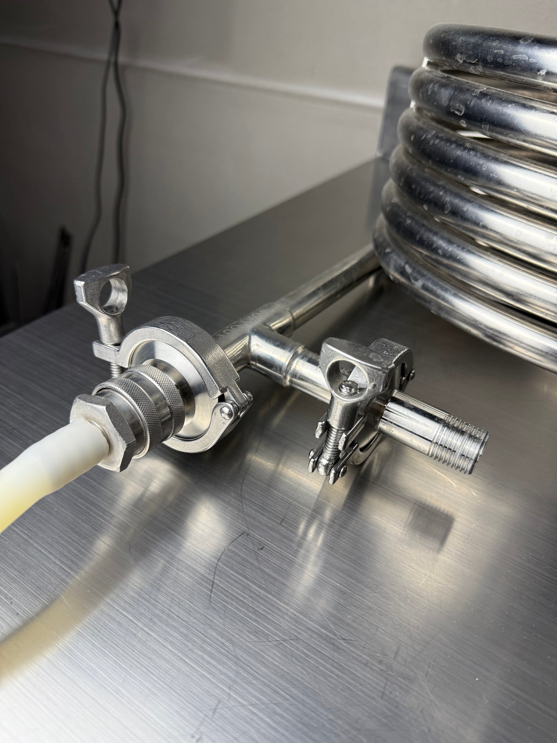 - Screw the DN15 fitting (½" thread) to your garden-hose quick connector and snap the QDs to your brewing system. Done.